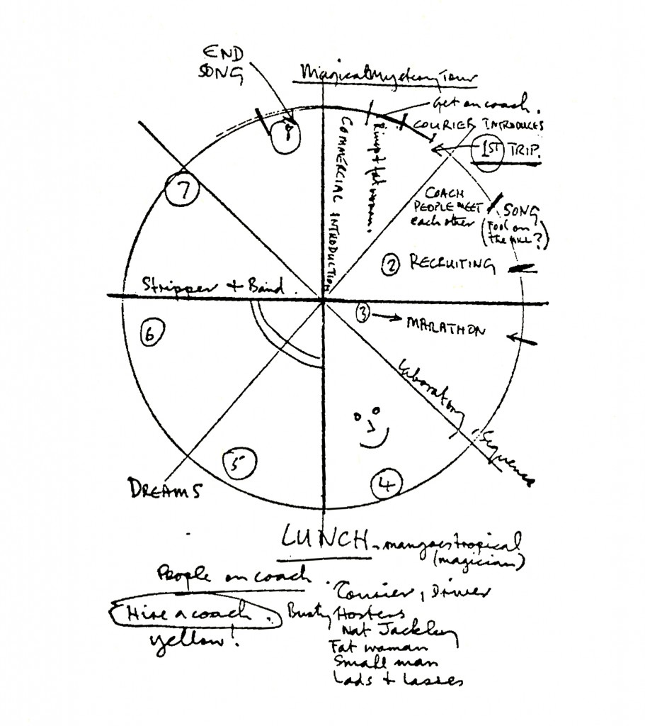 O problema é que por mais empolgado que Paul estivesse com aquele conceito, ele era apenas um jovem de vinte e cinco anos que havia dominado o mundo da música e estava delirando com a possibilidade de se tornar um autor sério. Havia começado a frequentar galerias de arte, a acompanhar cinema de vanguarda e a ler sobre cultura erudita. Aquele ímpeto jovem de se tornar um artista intelectual era bonito na teoria, mas na prática ele não tinha muita ideia do que fazer. E embora o filme tivesse sido dirigido e escrito pelos quatro Beatles, era ele o capitão daquela aventura e o aspecto livre de execução do filme seria perfeitamente exemplificado pelo roteiro escrito por Paul – um diagrama circular que funcionaria como ponto de partida para improvisos excêntricos e delírios lisérgicos da banda.